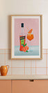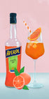 O ilustrație proaspătă și plină de viață a Aperol Spritz, cu o sticlă, citrice și un pahar de cocktail cu gheață și garnitură de portocale pe un fundal roz moale. Legendară și plină de culoare, această opera de artă surprinde esența culturii italiene de vară și aperitiv, perfectă pentru bucătării, baruri și spații sociale.