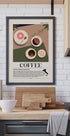 Un poster de inspirație italiană care arată un contur de cești de cafea, un desert și cuburi de zahăr pe o masă. Posterul evidențiază istoria și procesul de producție al cafelei, cu accent pe tradiția espresso italiană. Perfect pentru cafenele, iubitorii de cafea și pasionații culturii italiene.