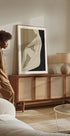 O opera de artă abstractă, calmă și minimalistă, care arată o formă feminină așezată în tonuri atenuate. Cu pensule picturale și simplitate modernă, lucrarea exprimă calm și relaxare, ideală pentru interioare moderne și decorațiuni artistice ale pereților.
