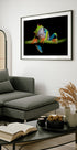 Un prim-plan izbitor al unei broaște copac cu ochi roșii (Agalychnis callidryas) cocoțată pe o tulpină verde pe un fundal negru adânc. Corpul verde vibrant, picioarele portocalii și ochii roșii strălucitori creează o compoziție fantastică plină de culoare și mister. Acest imprimeu macro natura este perfect pentru iubitorii de animale, iubitorii de natură sau cei care doresc artă de perete îndrăzneață și exotică