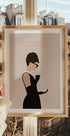 O ilustrație minimalistă și elegantă a unei femei într-o rochie neagră clasică, inspirată de moda și eleganța atemporală. Citatul „Eleganța este singura frumusețe care nu se estompează niciodată” adaugă rafinament, făcând această lucrare de artă perfectă pentru iubitorii de modă, case elegante și decor modern de perete.