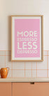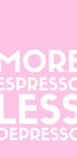 Un poster tipografie jucăuș, minimalist, cu text alb pe un fundal roz moale. Citatul amuzant „More Espresso Less Depresso” aduce umor și motivație, perfect pentru iubitorii de cafea și decorul modern pentru casă. O declarație distractivă pentru bucătării, cafenele sau birouri.