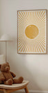 Această lucrare de artă prezintă un design minimalist în rază de soare, cu un cerc central care radiază linii drepte creând un model geometric îndrăzneț. Utilizarea culorilor calde oferă o senzație retro, vintage, perfectă pentru decorul modern și expresia artistică.