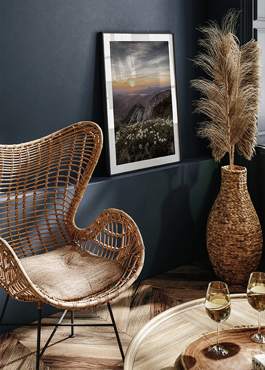 Poster cu răsărit de soare peste flori sălbatice de munte