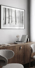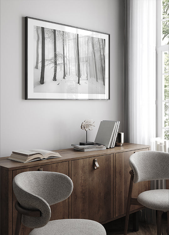 Un peisaj de iarnă liniștit se desfășoară în ceață și îngheț, unde trunchiuri subțiri de fag stau ca linii grafice într-un spațiu de pădure subțire și înzăpezit. Lumina este filtrată ușor prin ceață și creează o atracție meditativă care captează liniștea dintre copaci. O fotografie poetică a naturii de Tom Pavlasek. Perfect pentru o atmosferă de iarnă în casă.