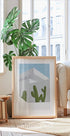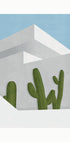 O estetică modernă a deșertului prinde viață în această ilustrație minimalistă cu cactusi verzi înalți încadrați de linii arhitecturale curate și un cer albastru calm. Interacțiunea dintre lumină, umbră și geometrie surprinde un moment de curte luminată de soare - un poster izbitor pentru interioare moderne și inspirate de natură.