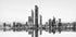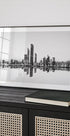 Pútavý čiernobiely plagát mesta Abu Dhabi, ktorý zachytáva modernú panorámu dokonale zrkadlenú v pokojnej vode. Umelecké dielo s elegantnými vežami, mestskými svetlami a zrkadlovou kompozíciou zvýrazňuje architektonickú eleganciu a pulzujúceho ducha hlavného mesta SAE.