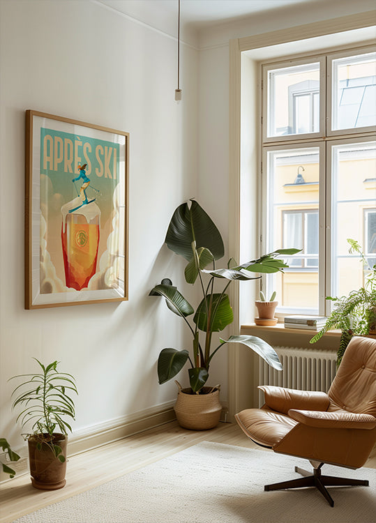 Hravý plagát après-ski zobrazujúci lyžiara rútiaceho sa dolu zo speneného pohára na pivo, zmes alpského dobrodružstva a oslavy après-ski. Výtvarné dielo s výraznými farbami a vtipnou ilustráciou zachytáva radosť zo zimných športov, slávnostné drinky a živú atmosféru horskej dovolenky.