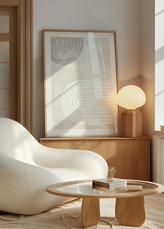 Upokojujúci minimalistický plagát s dvoma ručne kreslenými mašličkami v jemných béžových a bielych odtieňoch. Organické tvary a pokojná symetria vytvárajú vyváženú kompozíciu, ideálnu pre japonský, škandinávsky alebo moderný interiér.