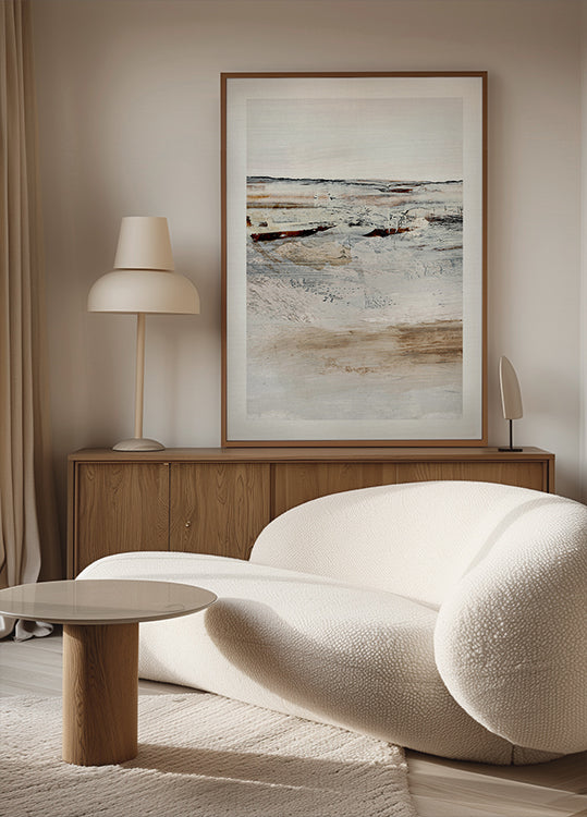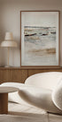 Pokojný abstraktný pobrežný obraz od Dana Hobdaya s vrstvenými textúrami a jemnými ťahmi štetca v zemitých tónoch béžovej, bielej a s nádychom hrdze. Minimalistická, maliarska kompozícia evokuje pocit pobrežných horizontov a spája modernú abstrakciu s prírodným pokojom. Perfektný kúsok do moderných interiérov s prímorskou alebo minimalistickou estetikou.