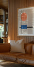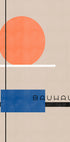 Minimalistický plagát inšpirovaný Bauhausom s výraznými geometrickými tvarmi vrátane veľkého oranžového kruhu a výrazného modrého obdĺžnika na béžovom pozadí. Priame línie a jednoduché kontrasty robia z tohto umeleckého diela nadčasový prvok v modernom aj vintage interiéri.
