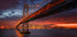 Úchvatný nočný pohľad na sanfranciský Bay Bridge osvetlený teplými zlatými tónmi na pozadí žiariacej panorámy mesta. Dramatická obloha za súmraku a odrazy vo vode vytvárajú pôsobivú panorámu mesta, ktorá je ideálna pre milovníkov mesta, cestovateľov a moderných interiérov.