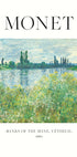 Pokojné impresionistické majstrovské dielo od Clauda Moneta namaľované v roku 1880, ktoré zobrazuje brehy Seiny vo Vétheuil. Umelecké dielo zachytáva bujnú vegetáciu, kvitnúce divé kvety a odrážajúcu sa vodu pod pokojnou oblohou. Nadčasový príklad Monetovho majstrovstva svetla, farieb a atmosféry.