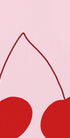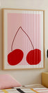 Hravé a živé minimalistické umelecké dielo s dvoma výraznými červenými čerešňami na jemnom ružovom pozadí. So štýlom pop art a čistými líniami dodáva tento kúsok do interiéru moderný a svieži nádych, ideálny pre kuchyňu, jedáleň a súčasné umenie na stenu.