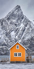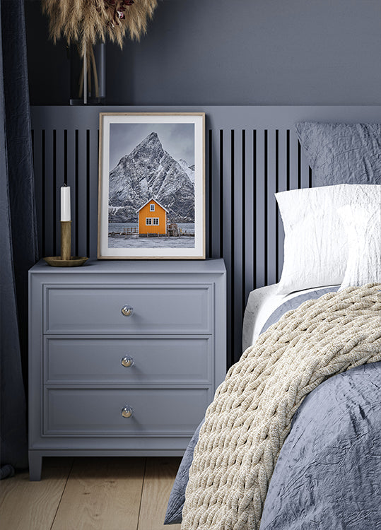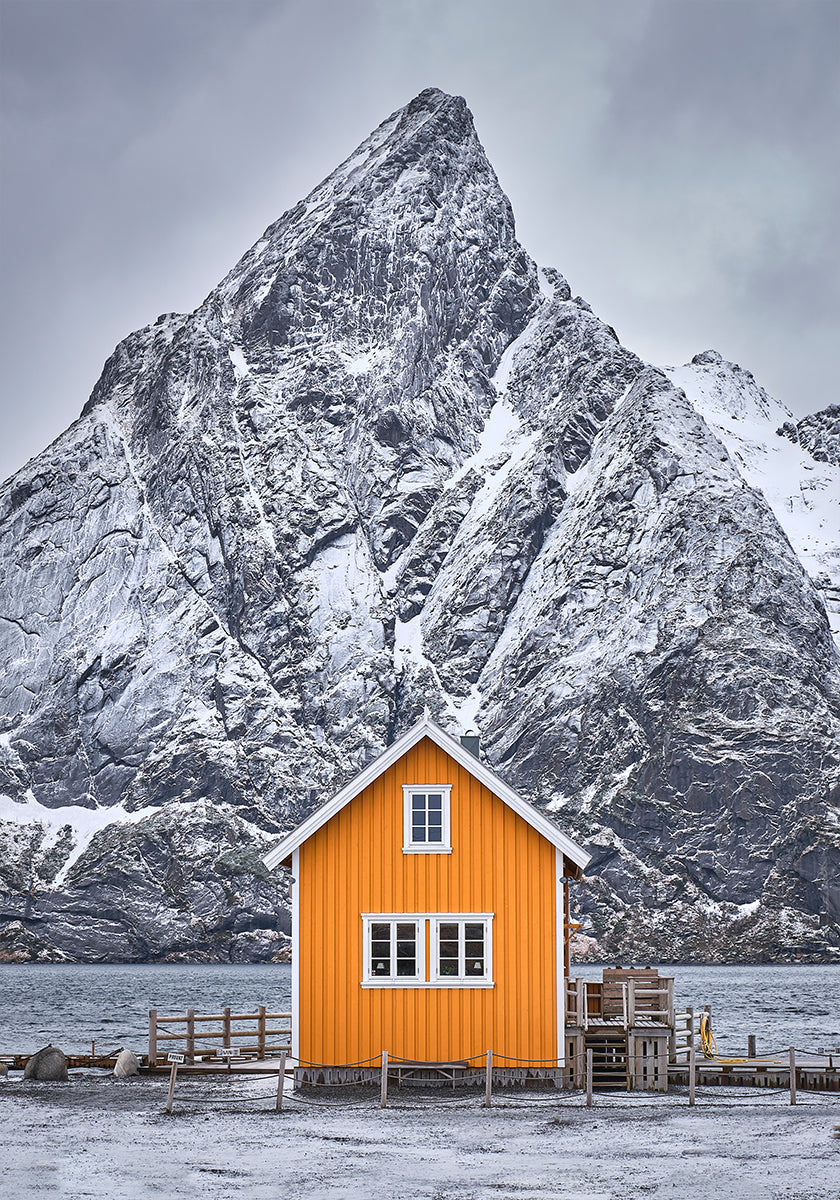 Tento evokujúci plagát od Hamed Bank zobrazuje osamelú žltú chatu na severskom pobreží, obklopenú zasneženými horami a tmavomodrým morom. Po oblohe sa vznášajú dramatické mraky, zatiaľ čo zimné svetlo zvýrazňuje kontrast medzi teplou farbou domu a chladnou, mrazivou krajinou. Pokojná, surová a nadčasová scéna, ktorá vyzýva k zamysleniu.