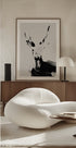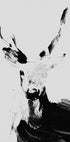 Ďalší abstraktný motív jeleňa v čierno-bielom prevedení, kde sa parohy elegantne rozširujú nahor dlhými plynulými ťahmi štetca. Motív je minimalistický, ale silný, prenáša pohyb aj nehybnosť.