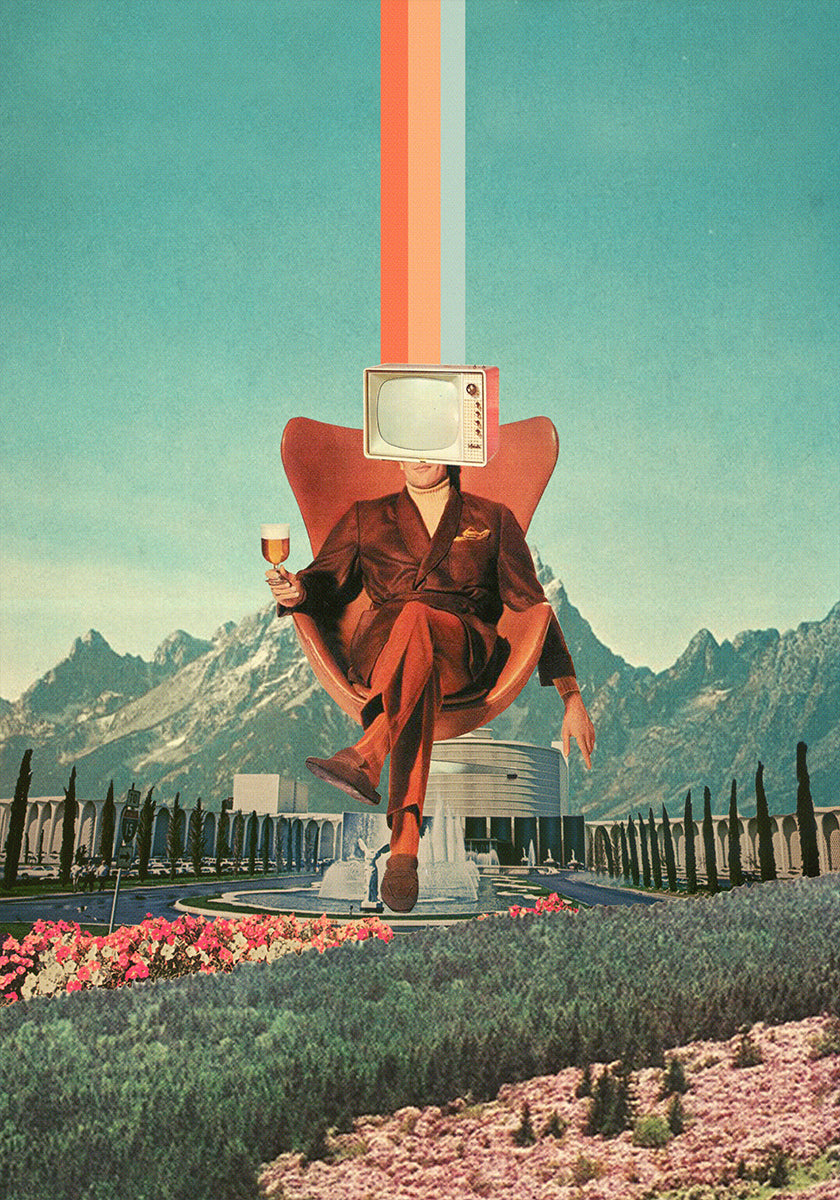 Surrealistická digitálna koláž muža v retro oblečení sebavedomo sediaceho v oranžovom kresle s pohárom vína v ruke. Hlavu mu nahrádza starý televízor, ktorý na oblohu premieta farebné pruhy. Scéna kombinuje futuristickú architektúru, horskú krajinu a kvetinové detaily, čím vytvára osobitý mix retro nostalgie a neskutočnej fantázie.