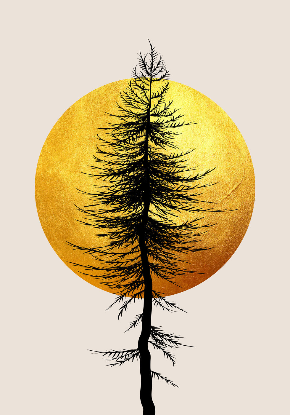Pútavá minimalistická kompozícia so siluetou čierneho stromu oproti žiarivému zlatému slnku. Textúrované zlaté pozadie vytvára krásny kontrast k jemným konárom a dodáva modernú a prírodou inšpirovanú estetiku. Ideálne pre milovníkov elegantnej jednoduchosti, škandinávskeho dekoru a moderného dizajnu.