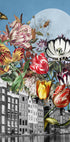 Plagát Marja van den Hurk spája žiarivé tulipány a jemné motýle v nápaditej koláži nad amsterdamskými kanálmi. Klasické štítové domy, mesačný svit a poetické detaily vytvárajú hravú, retro-surrealistickú atmosféru, kde sa príroda a mesto prelínajú vo farebnej, snovej harmónii. Pocta Holandsku, tulipánom a ľahkosti leta.